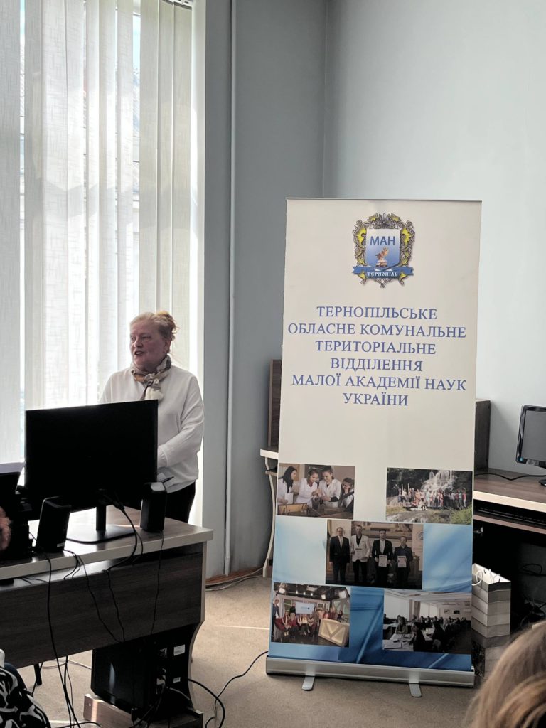 Свій дослідницький проєкт представила Ірина Рудніцька, слухачка Лановецької філії МАН, яка невдовзі презентуватиме свою роботу на ІІІ етапі Всеукраїнського конкурсу-захисту. Тема дослідження — «Реалії часу та мистецька символіка у творчості художника-воїна Олега Дробоцького».