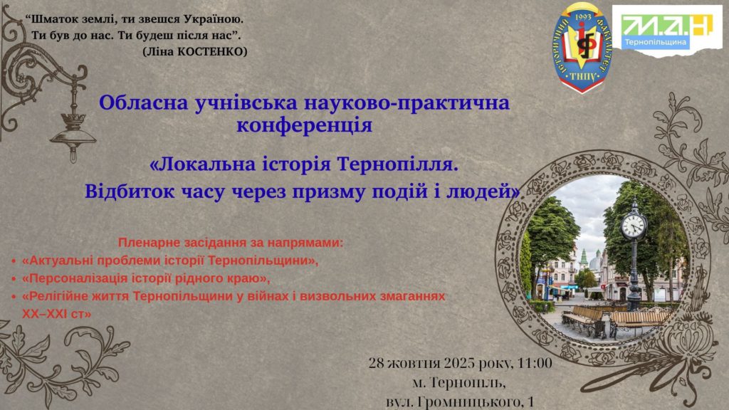 28 жовтня 2025 року спільно з історичним факультетом Тернопільського національного педагогічного університету імені В.Гнатюка, буде проведена обласна учнівська наукова-практична конференція «Локальна історія Тернопілля. Відбиток часу через призму подій і людей», що відбудеться за адресою (м. Тернопіль, вул. Громницького, 1). Програмою конференції передбачено пленарне засідання та робота секцій за напрямами: «Актуальні проблеми історії Тернопільщини», «Персоналізація історії рідного краю», «Релігійне життя Тернопільщини у війнах і визвольних змаганнях ХХ–ХХІ ст».